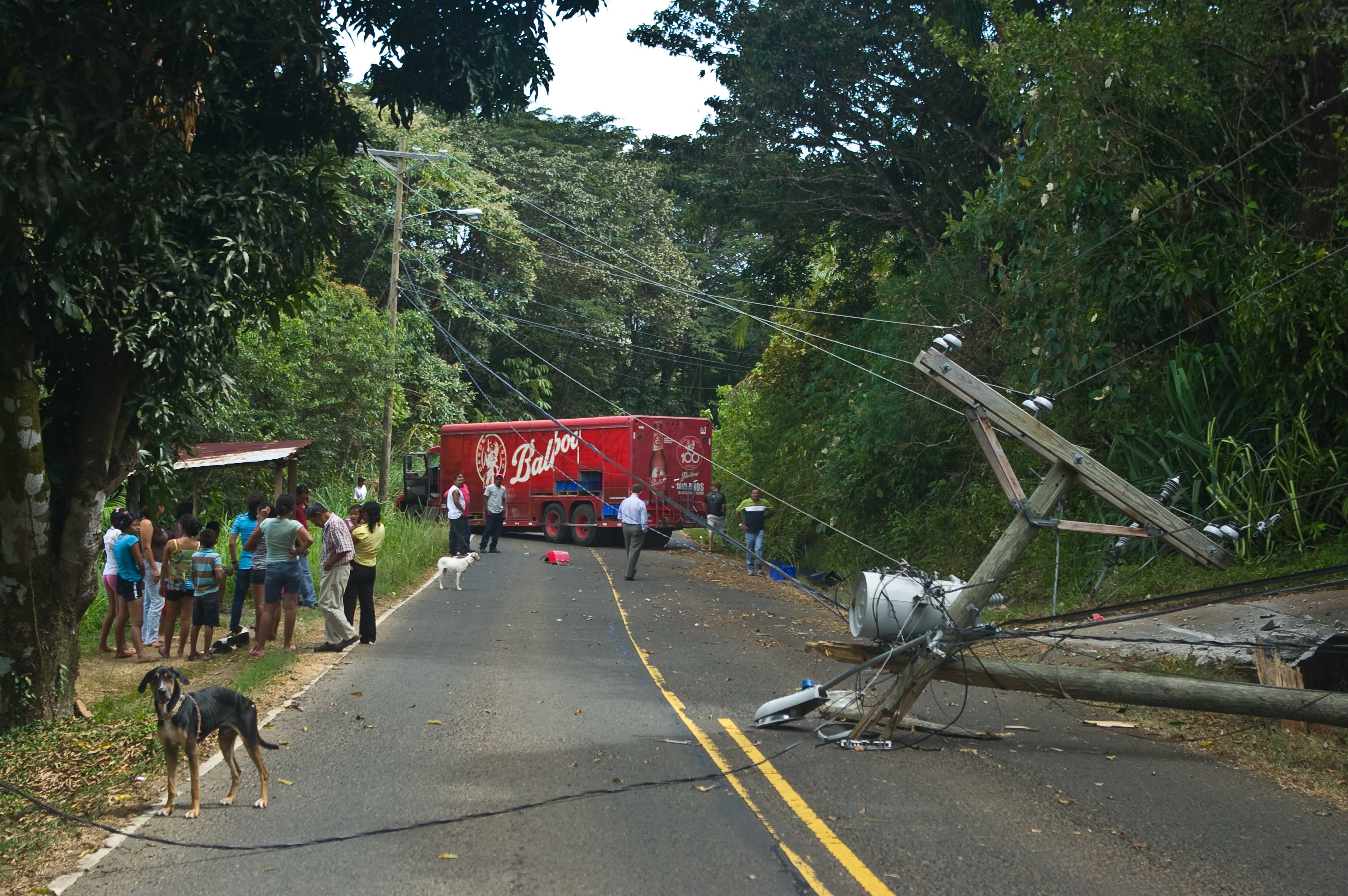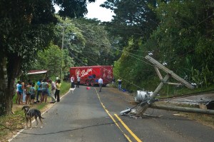We headed down the hill but about the half way point there was an accident. It didn’t look particularly serious, I mean there were no bodies lying around or such. A Balboa beer truck on the way down the hill had managed to take out one of the telephone poles on the right hand side which carries power up the hill and to our little community. Part of the fiberglass truck fender is broken and on the road. The truck was right across the road and very close to another telephone pole, which remained in tact. Maybe the popularity of this accident had something to do with it being a Balboa beer truck. I bet there was lots of speculation about how the accident happened. Maybe the driver was consuming some of his cargo. Maybe the driver was traveling in the middle of the road, as they tend to do here, and an oncoming car caused him to swerve and lose control. Maybe he lost his brakes. The never-ending possibilities seemed to be fuel for all the dialog amongst the growing crowd. Judging from how the truck was across the road, it wouldn’t have taken much for it to roll over and then everyone in the quickly growing crowd would be salvaging all those beers rolling down the hill on the pavement. Now that would draw a crowd! Traffic started to back up in both directions as everyone came out of their houses to see what was going on. The police were there but nobody seemed to be doing anything but standing around, pointing, and talking among themselves. After waiting some time, we decided nothing was going to happen very quickly so we turned around and started back home. It seemed to start something because a number of other vehicles did the same.