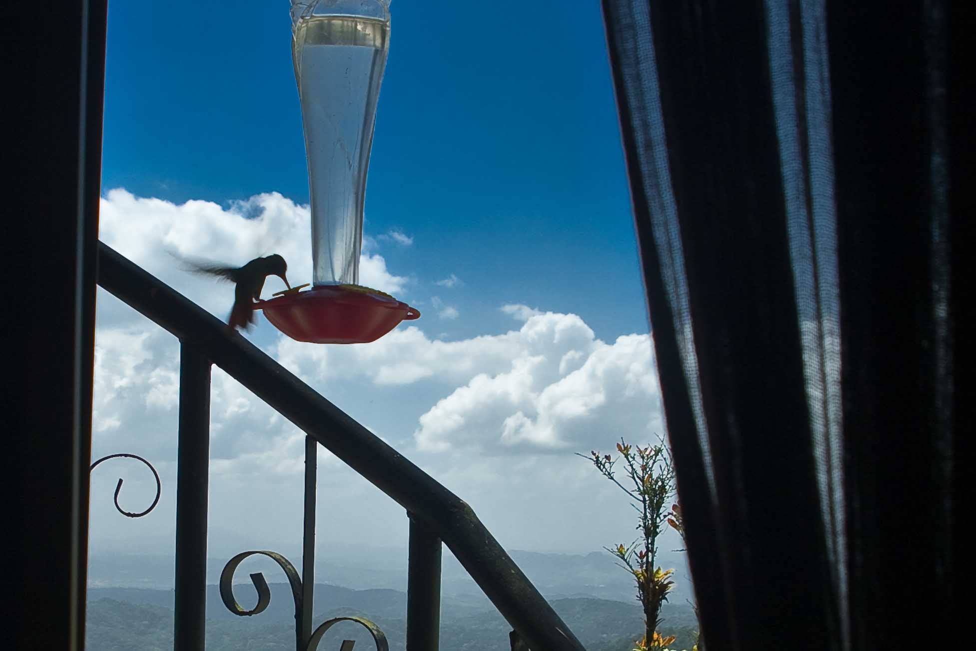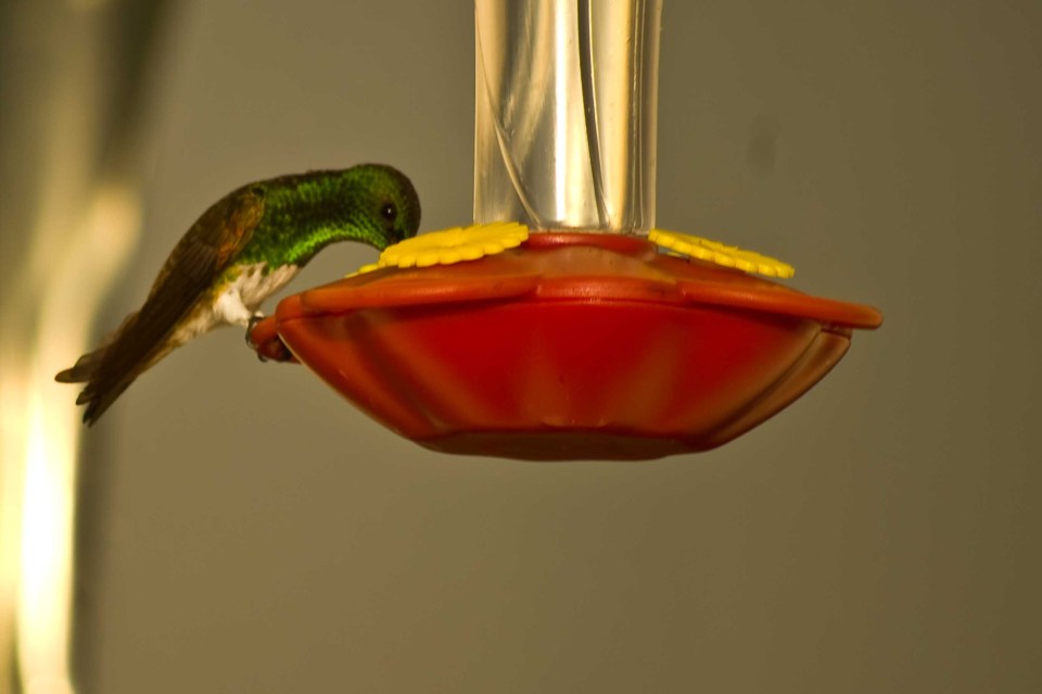 When we got home this afternoon, there was a scrap going on at our humming-bird feeder. There was an empty feeder here outside our dining room window and we have trying varying combinations of sweet stuff and water to attract the humming-birds. They don’t like pancake syrup and water! Now they know it is here as you see them coming to check it out but after a quick taste they leave. It’s like they think that if there are people around the house, the feeder should be full. Each visit is accompanied by a chirp, as they leave as if to thank us for filling the feeder. Finally, we found out that the magic combination is one part sugar to four parts water and you have to warm the water to make sure all the sugar dissolves. Picky, picky! So once we had the right formulation, more hummingbirds came and they would stay longer. But back to the scrap. There is one bird, the smallest one, who seems to think the feeder is his own private domain. He will allow only one other bird to feed with him, maybe he is trying to impress his girlfriend. He keeps a close eye on the feeder and when another bird comes too close, he puts the run on them. It’s funny to see the caution the other birds exercise when they approach the feeder to be sure the feisty little one is not around to give them trouble.