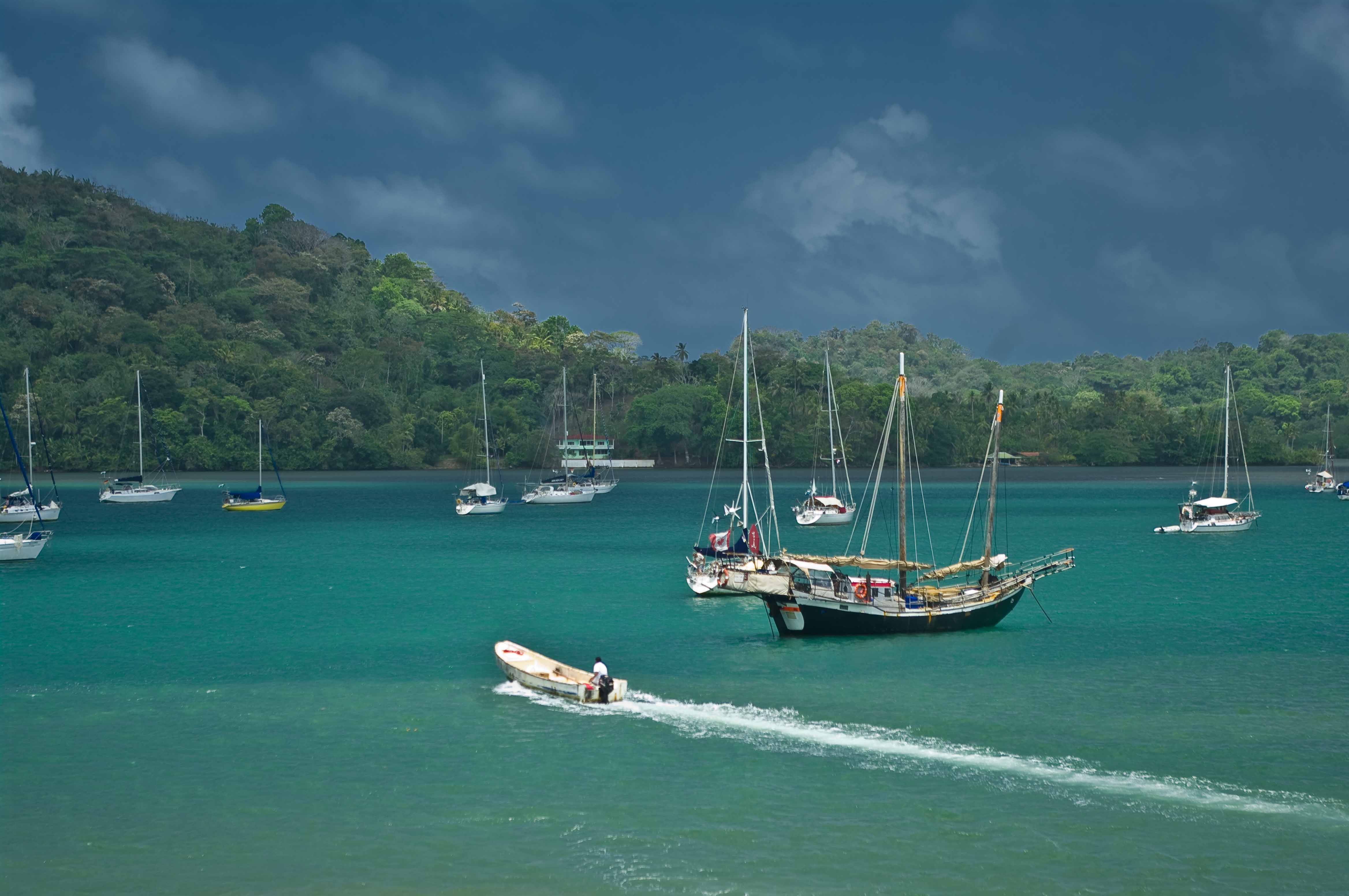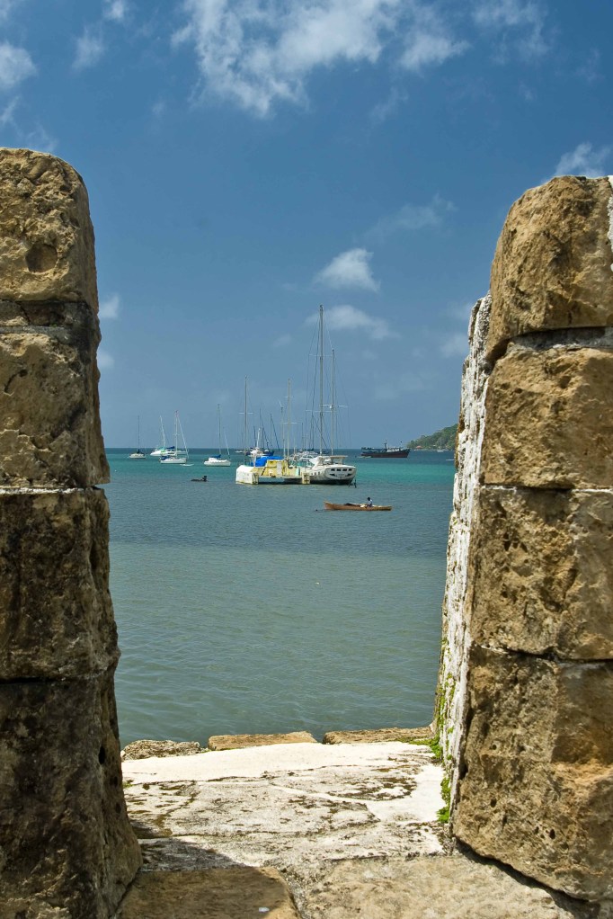 Eventually, we come to one of the forts of Portobello and park to prowl the ruins. The landscape is a beautiful variety of greens with the Caribbean water showing its well-known aqua and green patchwork color scheme. There is a large hilly island in the distance, perhaps a kilometer across the yacht strewn water. The dark blue almost cloud free sky along with the aqua waters and snow-white hulls of the fleet of pleasure yachts moored in the area paint an incredibly beautiful seascape that is only complemented by the small pieces of history from the fort that I am able to inject into the images from my camera. This place is drop dead gorgeous!