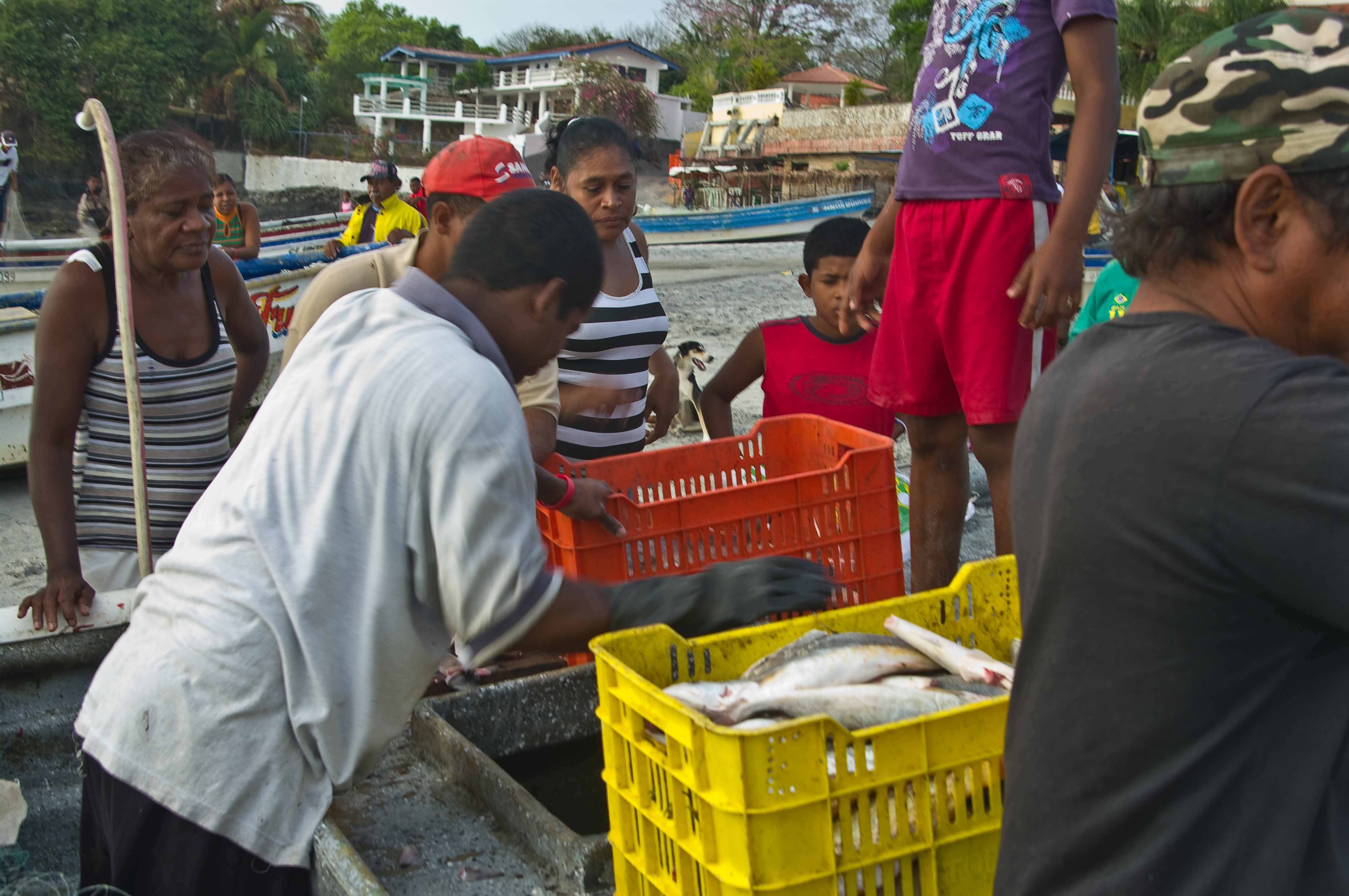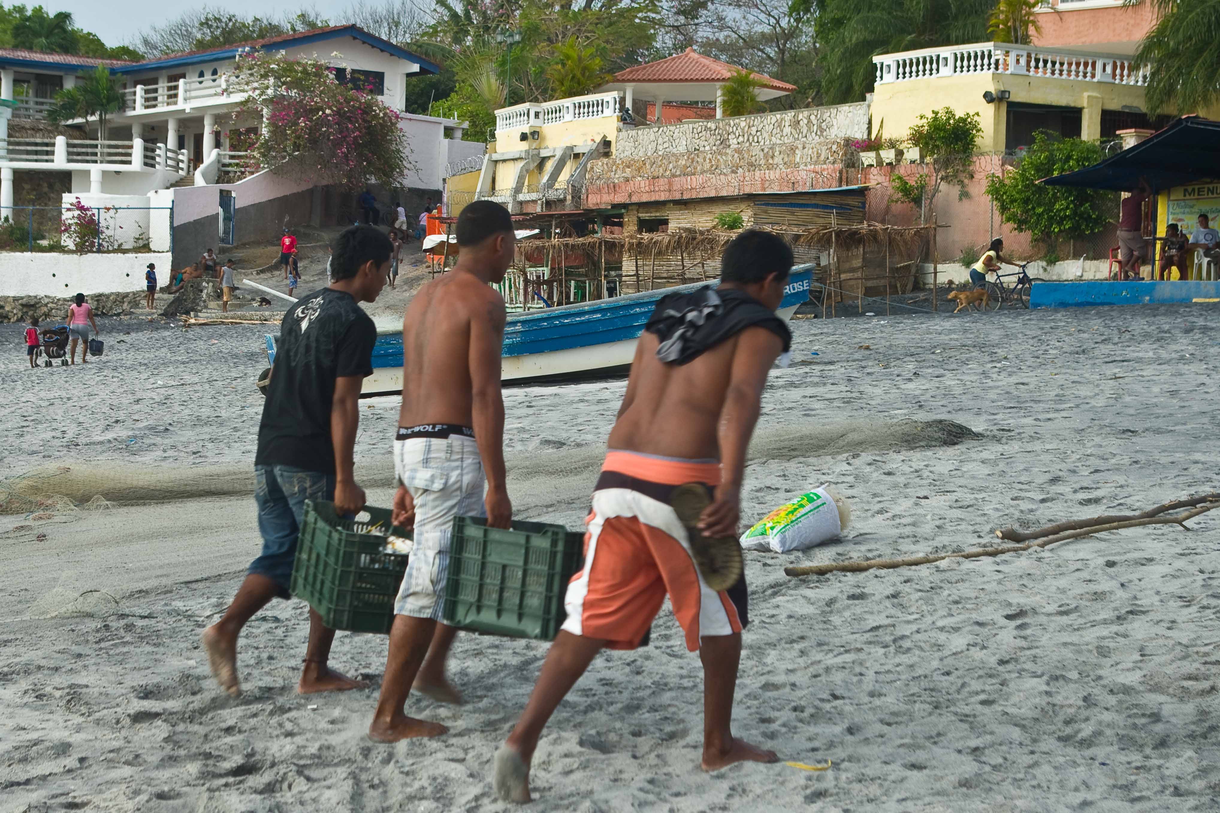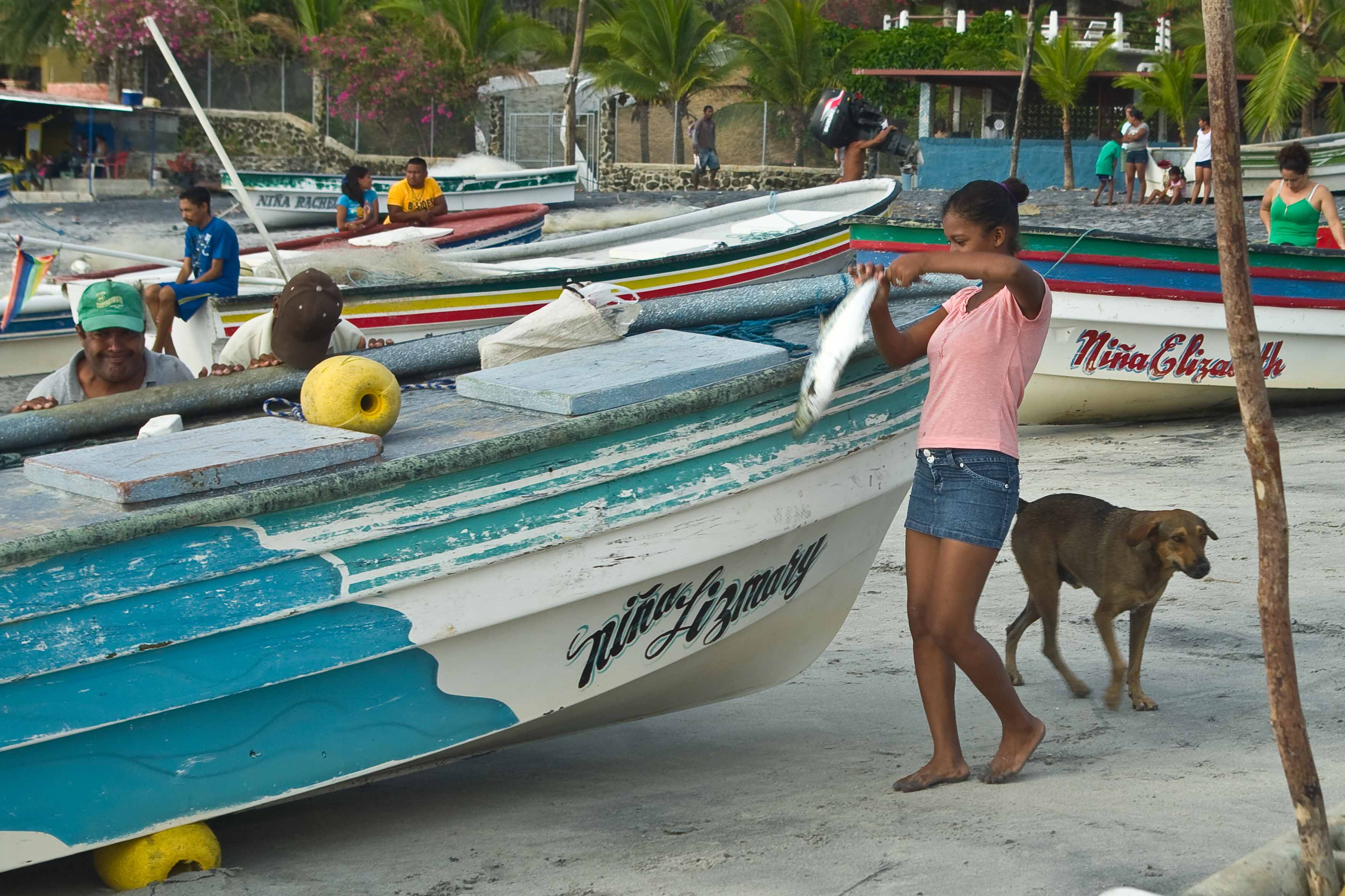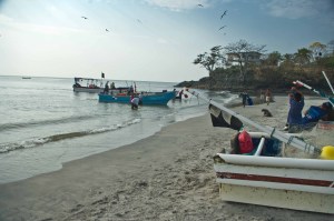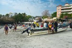 I decided to have a look at what went on in Gorgona as the fishing fleet arrived back with the day’s catch. A short 15 minute walk down the beach took me into the middle of the busy activities. The whole fishing community turns out, from small children to aging adults, on the beach to greet the returning fishermen. If you look carefully you will see that the chaotic activities on the beach are actually quite well controlled. A man on the beach directs each boat, one at time, to run up on the beach in a designated place. The boat takes a run at the beach from about around 100 yards out, building sufficient speed to shoot the boat up on the sandy beach some 10 or 20 feet. The boatman tilts the outboard motor out of the water at the last-minute as the boat hits the beach.