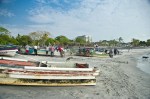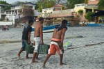 Once the boat has stopped, several men gather around the back of the boat to remove the motor and carry it up on the beach to a secured locker. At the same time, a crowd descends on the boat to find out how successful the day’s fishing was. They bring brightly colored plastic buckets to load the catch and separate the different kind of fish. Once the fish is loaded others, two at a time, haul the filled buckets up the beach to a large assembly line cleaning station, where some fish are fileted.