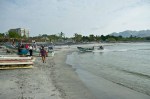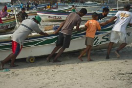 Once a boat has been unloaded, a group of 10 or so people gather on each side of the boat to drag the unloaded boat higher on the beach so it will be safe from a high tide. They place a couple of round rubber or plastic floats on the sand on each side and actually drag the boat up the beach over the floats, making the job easier. It reminded me of some of the programs on TV where they were trying to illustrate how the huge stone blocks were hauled up the side of the pyramids in Egypt using round wooden tree trunks.