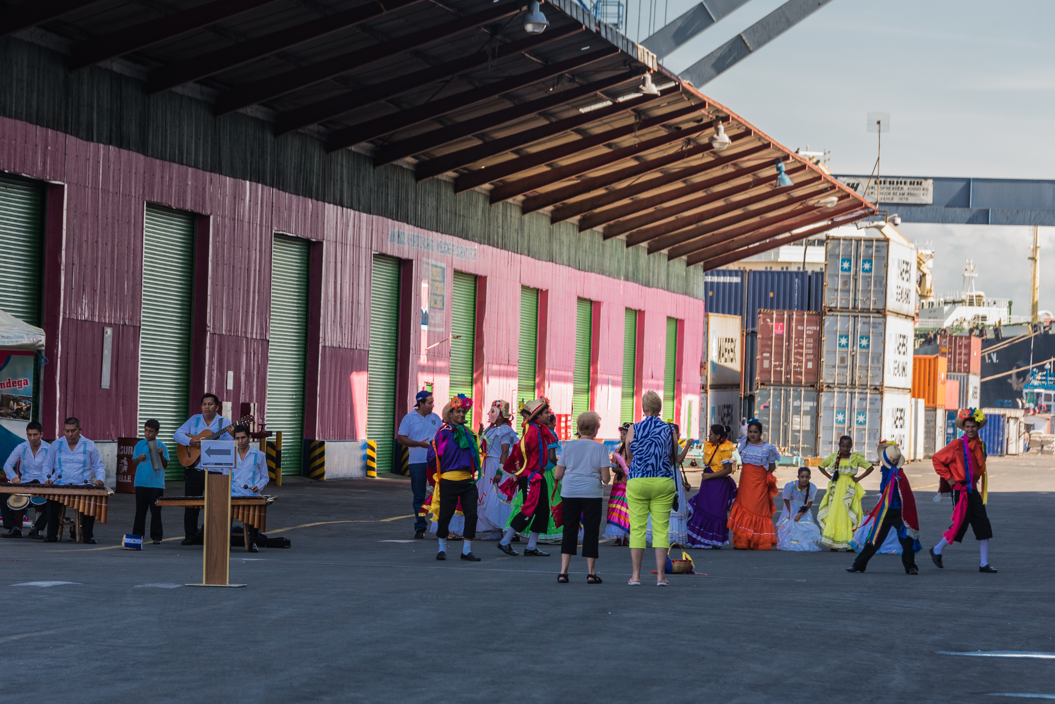 Nicaragua is the second poorest country, next to Haiti, in the western hemisphere so tourism is extremely important to their economy. Major Nicaraguan exports are sugar and coffee. Again, we were the first cruise ship of the season to visit them. Eleven hundred passengers had booked shore excursions to explore Nicaragua. Vividly colored tour busses gathered on the dock between two of the metal sheds. They were close enough to the ship so you could almost walk off the gangplank right onto the bus. A band and a group of colorful local cultural dancers were performing on the dock as we left the ship.