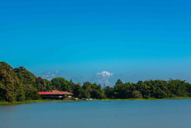 Turning toward Gamboa, we are in a National Park. We proceed along a jungle lined cement two lane not too smooth roadway that takes us over the summit, where you will find a large popular Zoo. Continuing on about 10 kilometers, we come to a single bridge which also has track for the Panama Canal Railway. Shortly before the bridge, we pass the prison that houses Manual Noriega, the infamous Panamanian President come drug lord.  Crossing the bridge we find the small town of Gamboa. This location is about half way through the canal and is the base for the dredging division of the canal. Here, you will also find the Rainforest Resort, which is a pretty expensive, beautifully located hotel in a remote place right on the shores of the Chagress River. They have a restaurant right on the Chagress River, which is  worthwhile for lunch.
