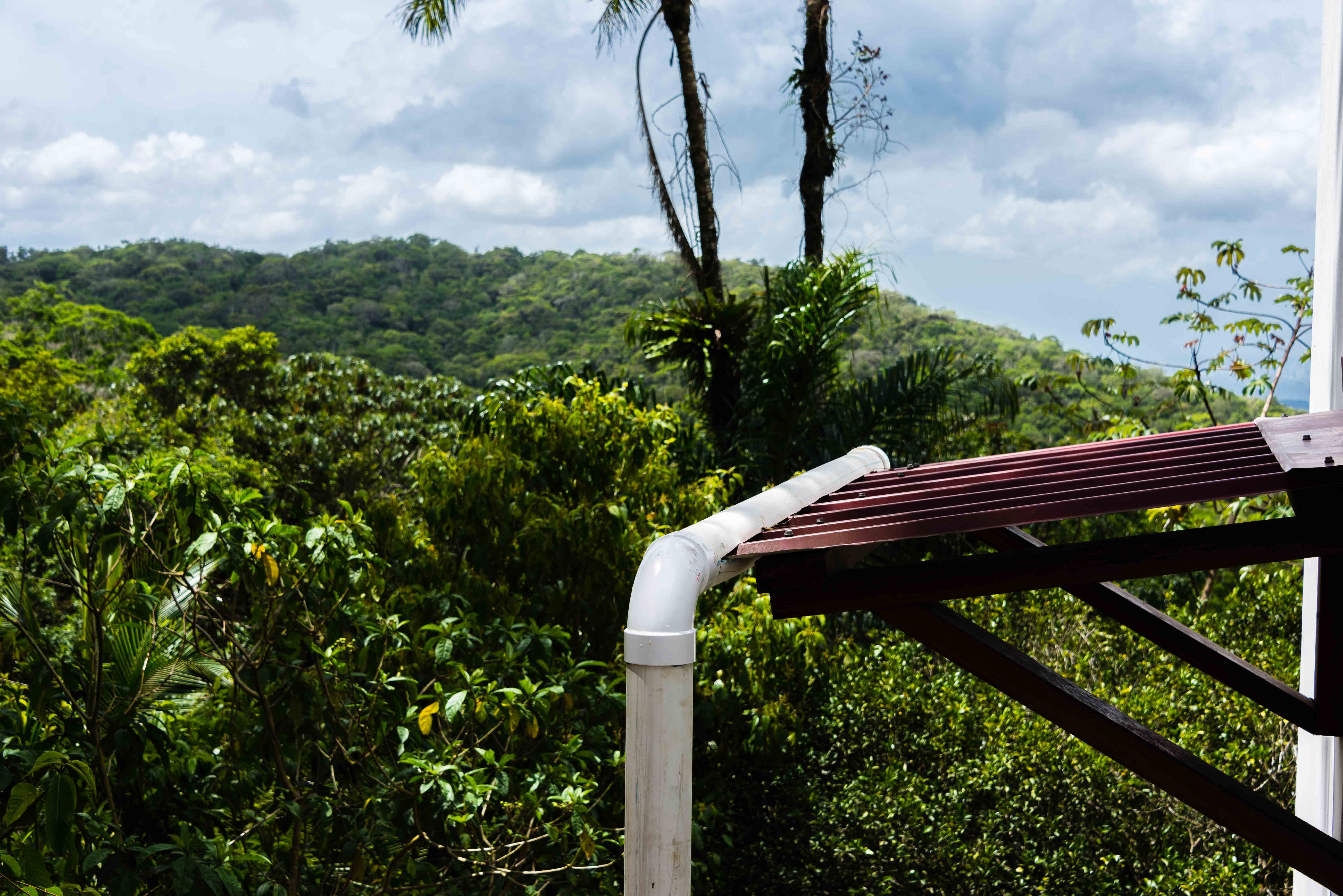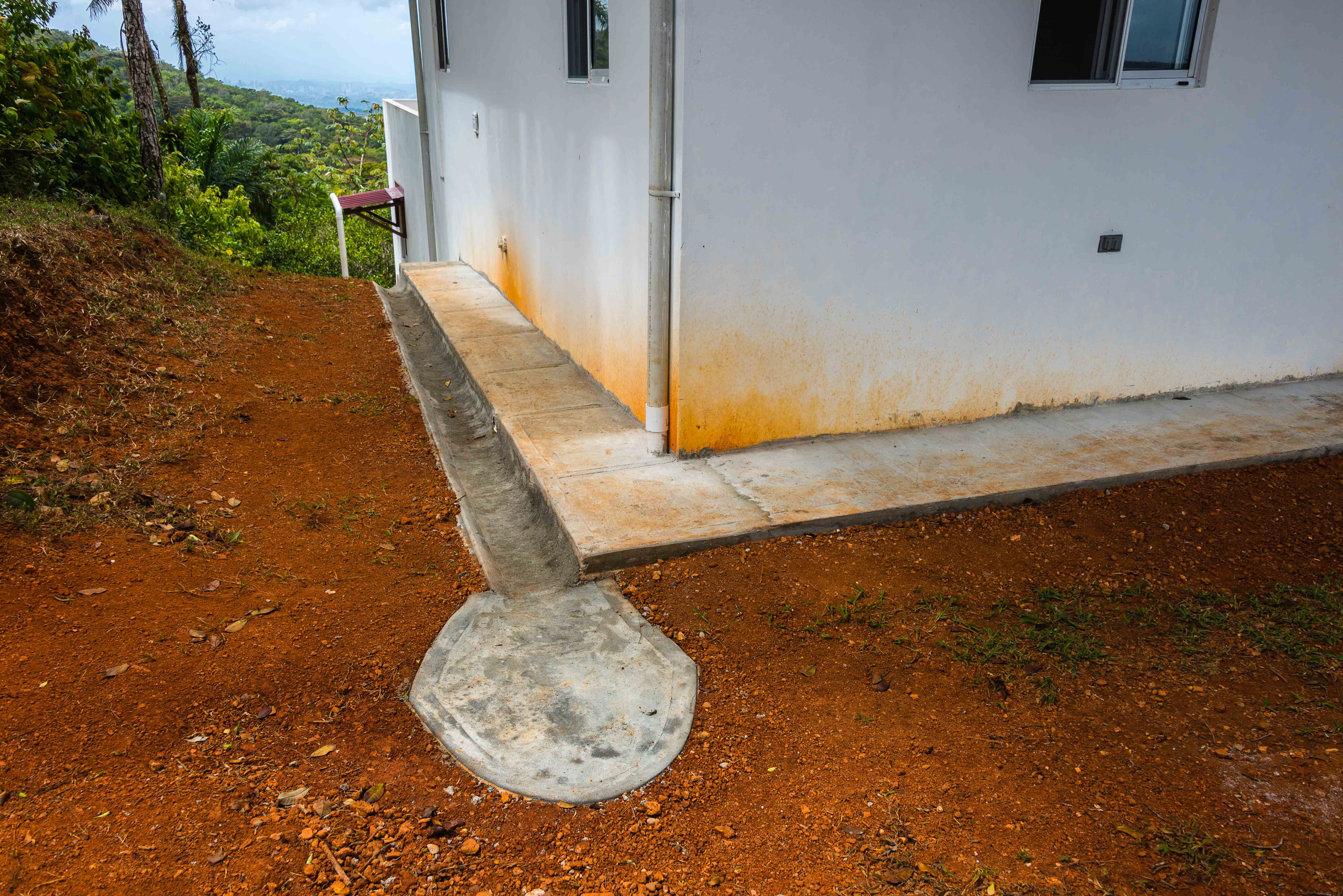 Last year, our lower level under the front deck, got quite a bit of water into it. The water was coming through the concrete wall and eventually pooled in the middle of the room. Our investigation showed that there was a hole outside the house, just at the place where the water came in. The outside drainage had run into the hole and into the house. This side of the house is a problem as the ground slopes toward the house. The side of the house is also badly stained from the heavy rain splashing the mud up on the house. It is also difficult to walk down the side of the house due to the steep slope of the ground. Our solution was a series of things. First we build a narrow sloped sidewalk out from the house. This will improve access as well as keep the rain from staining the house when it hits the mud. Next to the sidewalk, we built a small open concrete trench from the top of the house all the way to the bottom. Downspouts were extended and now drain into the trough as does the surface drainage from the sloped ground beside the house. We think this will solve our problem with water in the downstairs area as well as improve access and protect the house from mud staining.  We installed a Panamanian eves trough on a small roof.  Interesting… take a three inch plastic pipe and cut a slot the length of the roof then slide it over the edge of the roof and put a downspout on it.  They love plastic pipe here!