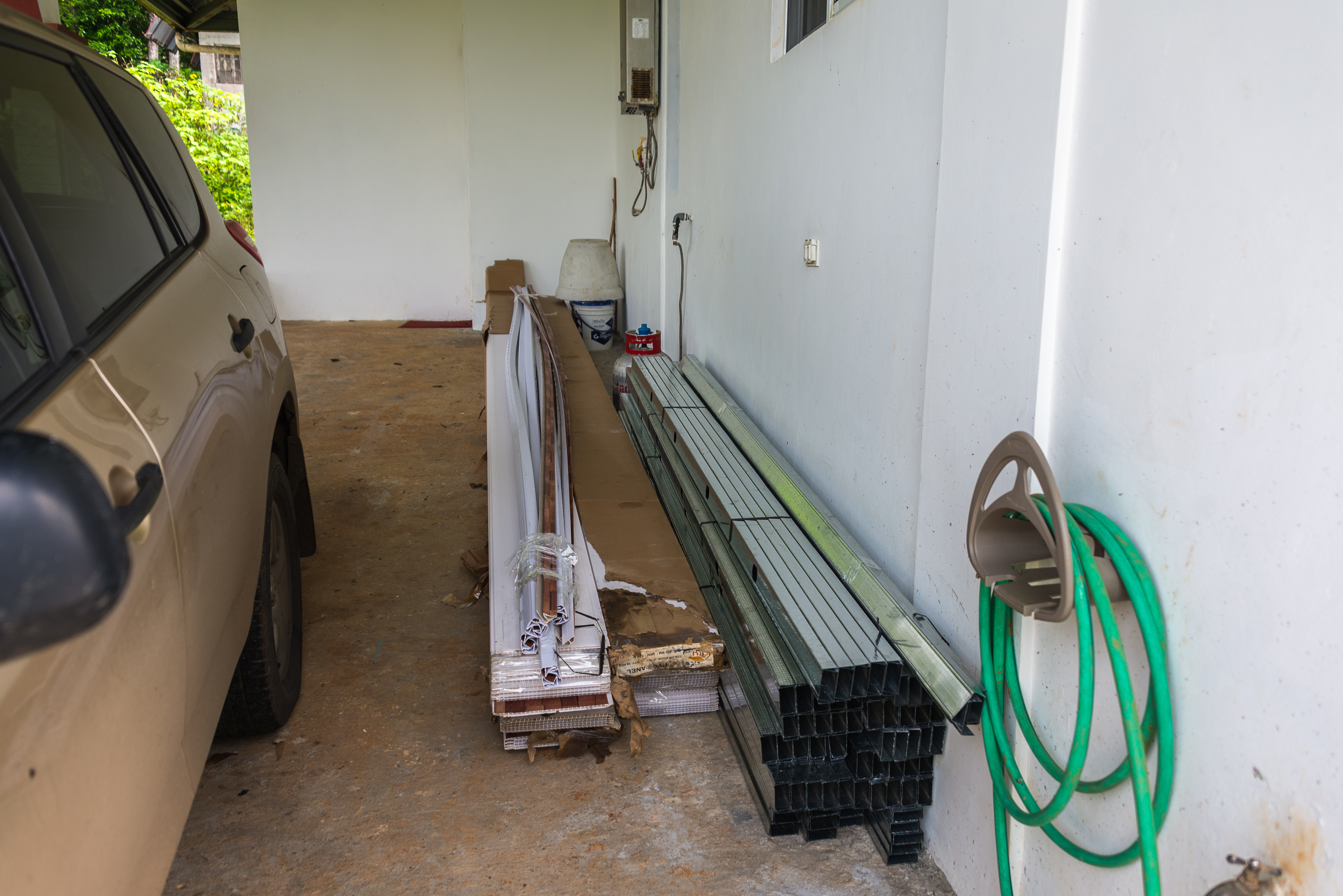 The start date was quick so we had to get our choice of PVC, track, and studs not only bought but hire a truck to pick it up and transported everything to our house up the mountain. We hired the same truck that brought the ceramic tile for our outside deck up last year.