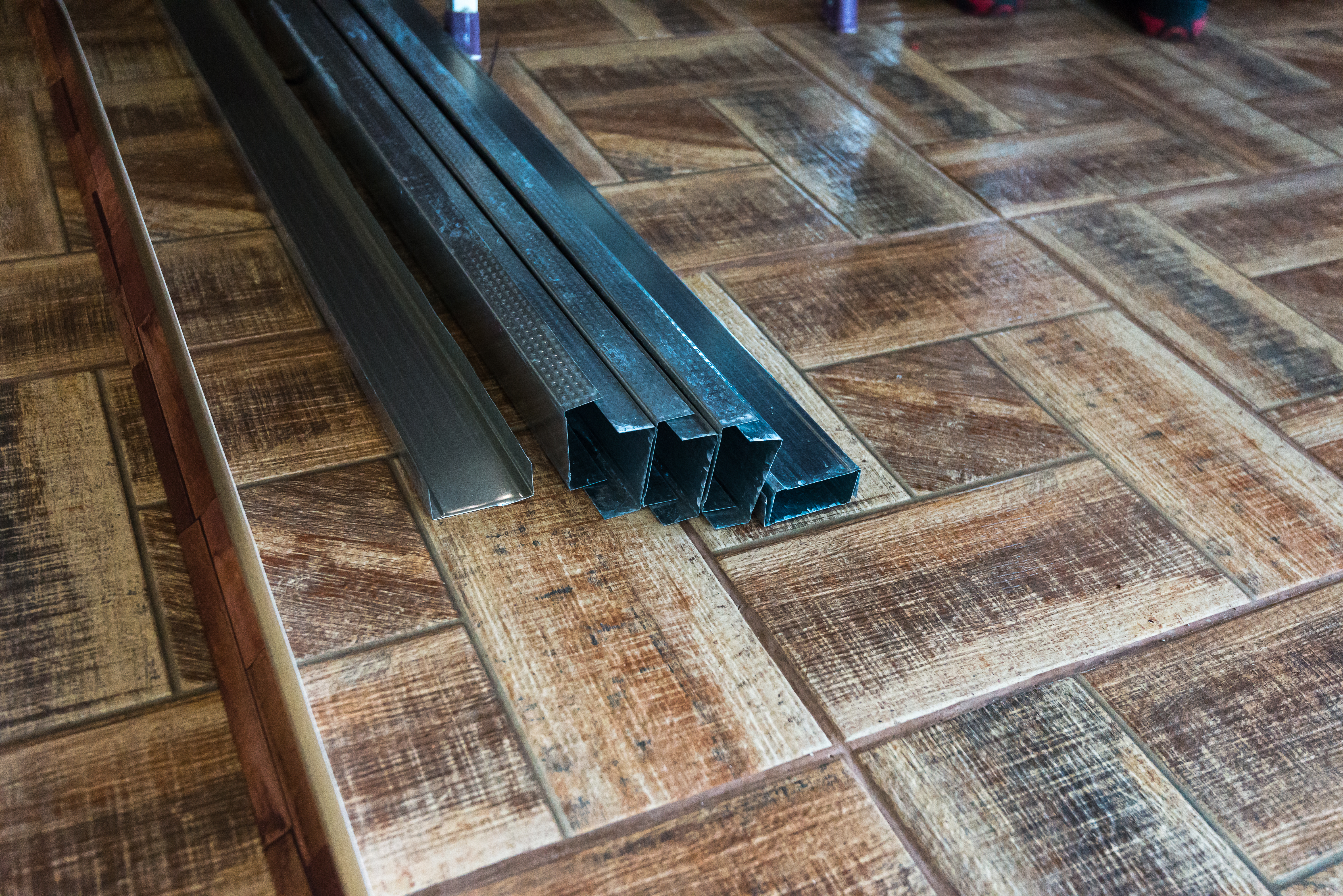After the room has studs and tracks completed, the next step is to screw the edging pieces to the bottom of the studs using self-tapping sheet metal screws. Once the room is complete, the actual ceiling is installed. The guys on the scaffolding measured the needed length and the guys on the floor cut the piece to the correct length. Our ceiling material comes in about nineteen and a half-foot lengths. The two ground guys deliver the cut piece to the scaffolding team, who insert the ends into the edging piece and slide it up to the previously installed piece. Two ceiling pieces snap together on one side, similar to laminate flooring. The open side is screwed to the track, using self-tapping sheet metal screws. Every piece is secured this way except the last piece which is the most difficult to install. It snaps into the earlier piece but is left loose in the corner moulding on the side normally screwed. Done right, you cannot see any difference.