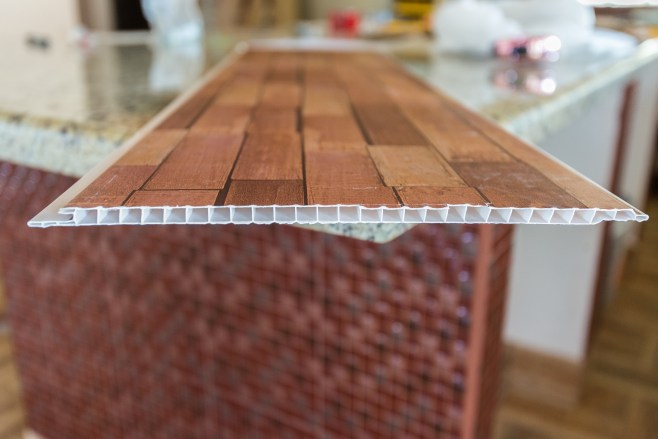 As this product comes in many different finishes, patterns, and colors the next job was to make the rounds of the building stores to find something that we liked. In keeping with our wood theme, here is what we settled on.