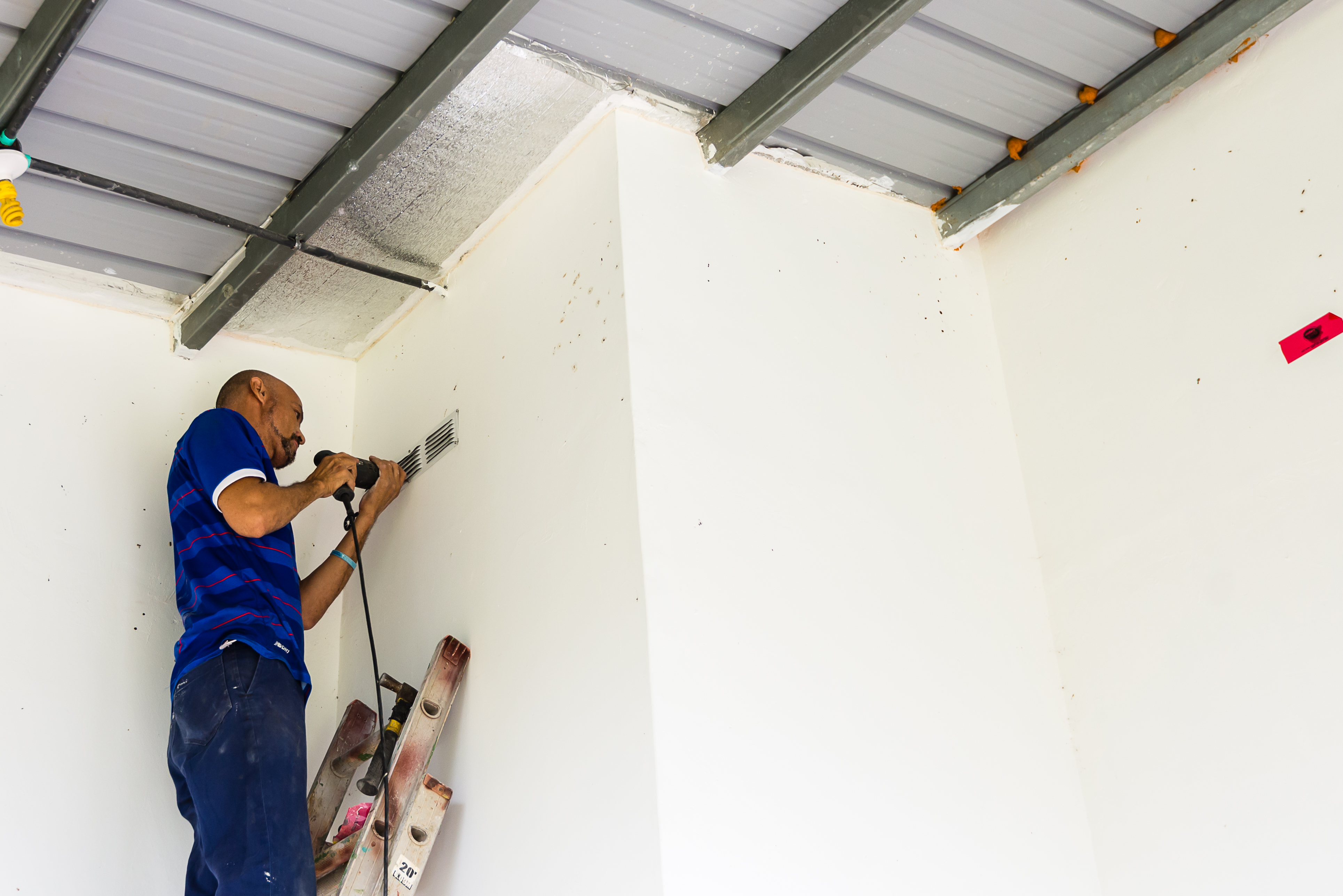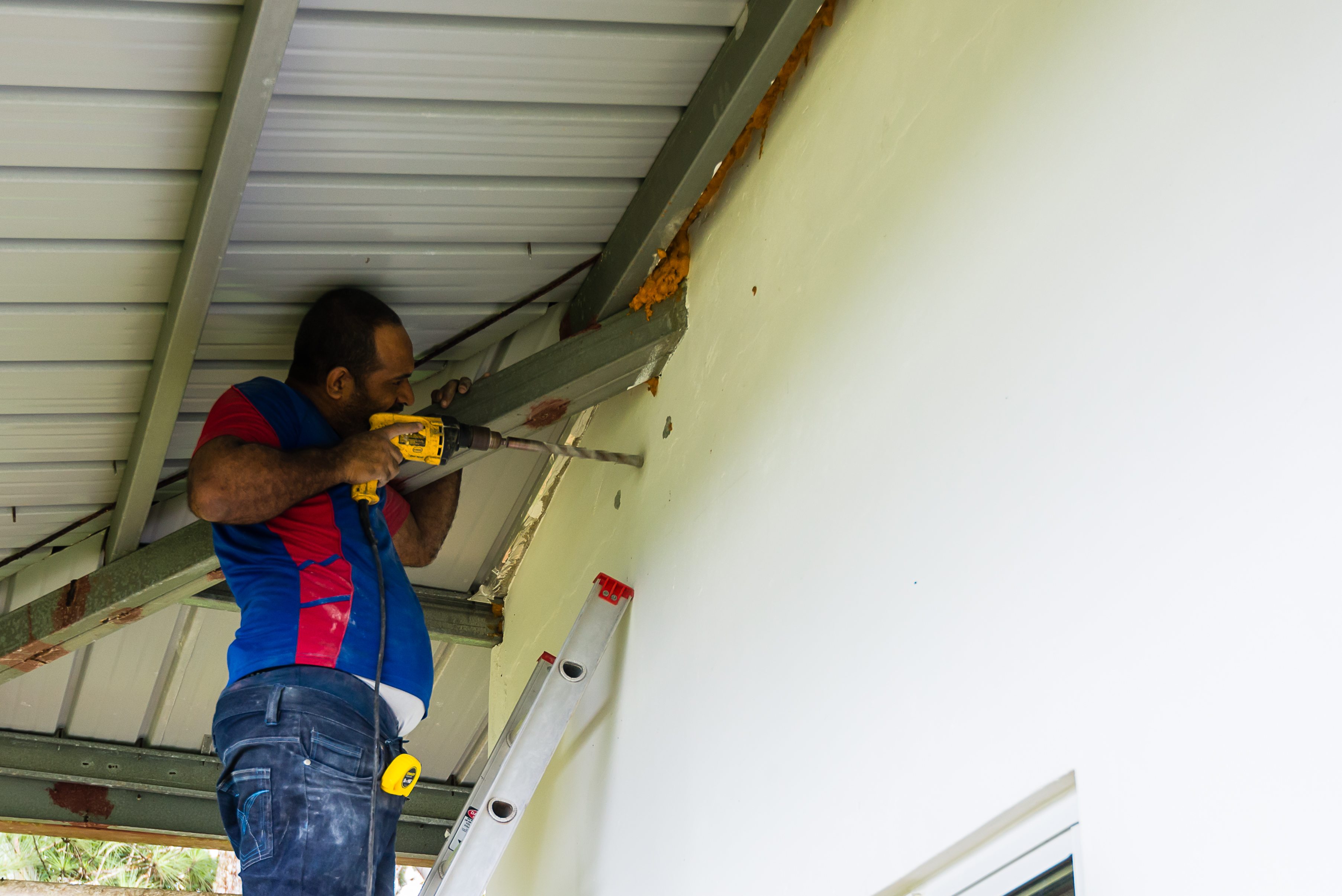 The dirtiest part of the job was the drilling of holes in the concrete wall between the new ceiling level and the existing roof. This is for ventilation. If you don’t do this the air between the ceiling and the roof is trapped and the humidity will have no way to escape. This will result in condensation, mould, and odor, none of which we want.