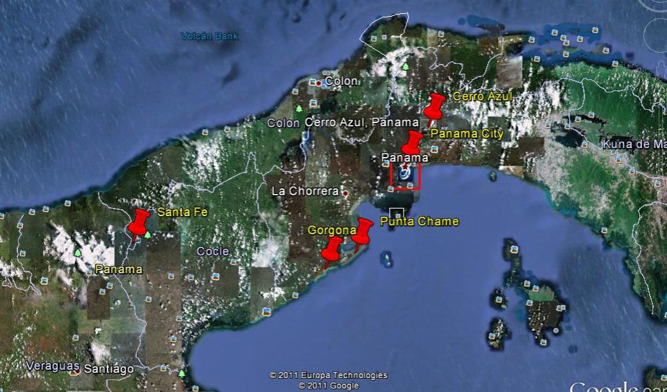 The red push pins in the map show the locations we are planning to visit this year.  Our travels will begin in Panama City where we will stay for a couple of days and then we will move on to an area called Cerro Azul, which is up in the hills, above Panama City.  We expect it will be cooler there.  Next, we are off to Santa Fé , which is about a 3.5 hour drive from the city, where we will have a few days at a remote resort that is a bird sanctuary up in the mountains near the Santa Fé National Park.  We will then move to the Gorgona area in early February for some beach therapy and finish up at a resort in Punta Chame to complete the hot sand therapy, returning home around mid March.